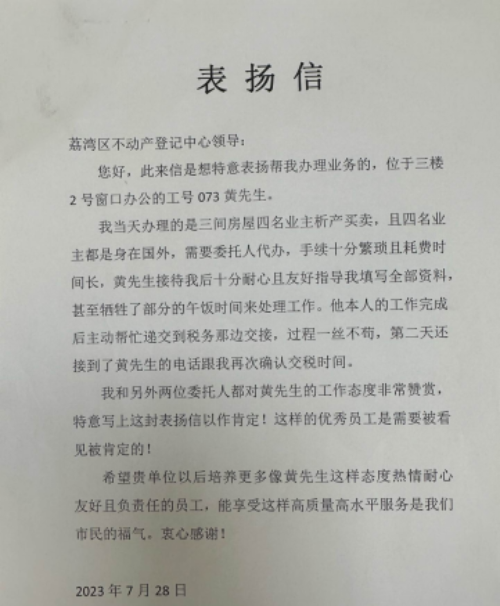 2023年7月28日,该业主的代理人将表扬信送到荔湾区不动产登记中心,对该中心工作人员认真负责有担当的工作态度、为群众排忧解难办实事的工作实绩给予高度赞扬和肯定。