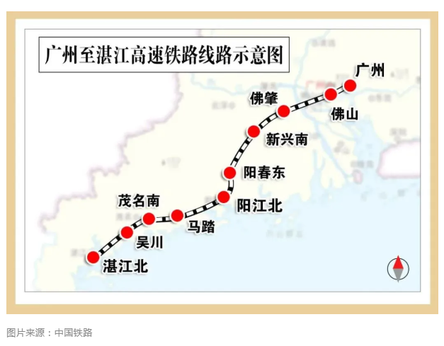 广湛高铁通车后,广州至湛江将实现最快90分钟互达,将大幅缩短粤西地区与粤港澳大湾区的时空距离;同时,将极大提高通道输送能力,加快构建粤港澳大湾区与粤西地区高速铁路通道,助力国家战略对接,促进协同发展。