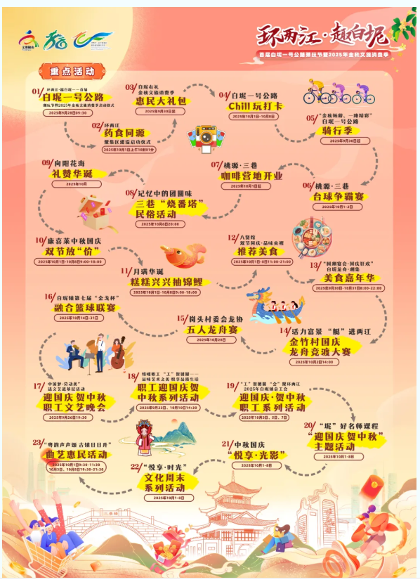 《风起西江·潮白坭》文旅大片首映、《桃源·三巷》新书首发、药食同源美食一桌菜发布、第三批“白坭文旅掌门人”颁奖、白坭镇文联及新一批文体协会成立、白坭一号公路chill玩旅游地图发布、白坭一号公路十大重点文旅项目焕新仪式……“首届白坭一号公路潮玩节暨2025年金秋消费季”全面开挂!一条主线超二十项过百场文旅活动串珠成链,推动“交通+旅游+文化+消费”深度融合,大力发展假日经济、赛事经济、夜间经济,实现“金秋畅游、一路精彩”。