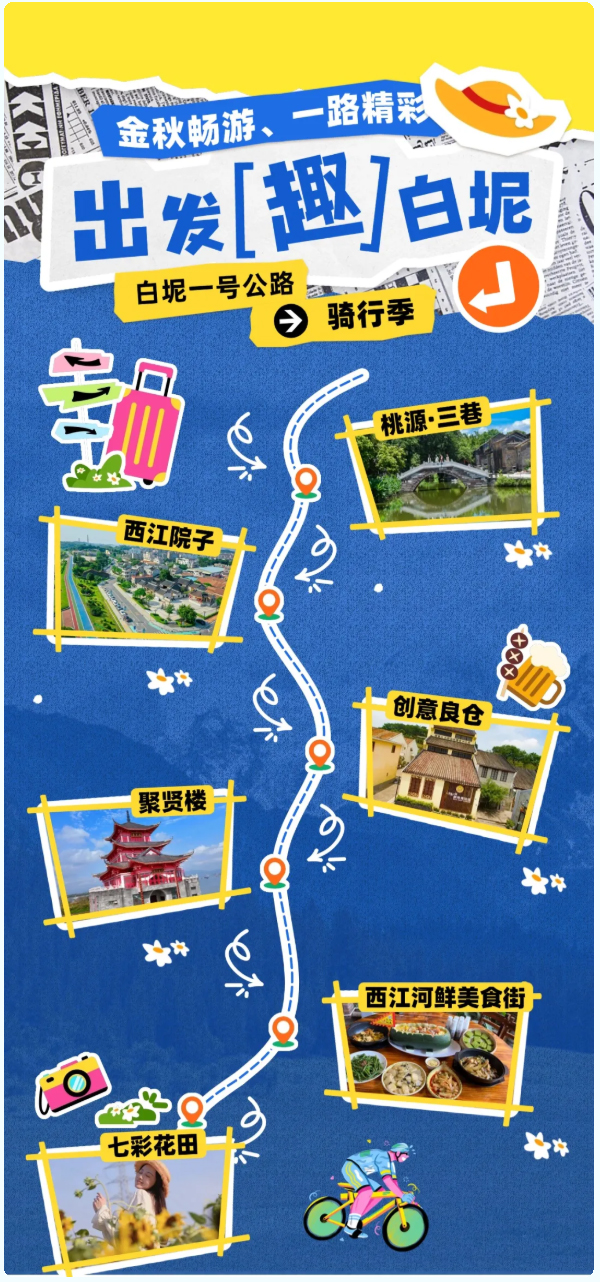 国庆来白坭一号公路,一张chill玩旅游地图串起桃源·三巷-西江院子1511、西江公园、创意良仓、聚贤楼、七彩花田等大潮拍站点,出片率100%,这个假期用最潮姿势把秋色收割!