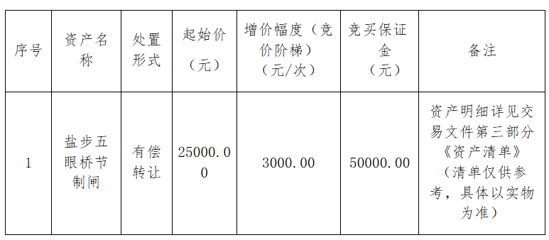 4.本项目以资产评估价25000.00元作为资产竞拍起始价,增价幅度3000元/次,最终成交价确认该项目资产总值,双方根据最终成交价签订《成交确认书》,由竞得人按成交价的总额支付给处置单位,全部资产归竞得人所有。