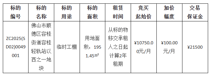 出租方采用网上竞价方式出租位于佛山市顺德区容桂街道容桂轻轨站以西之一地块租赁权竞投,欢迎符合资格的竞买人参与竞价。