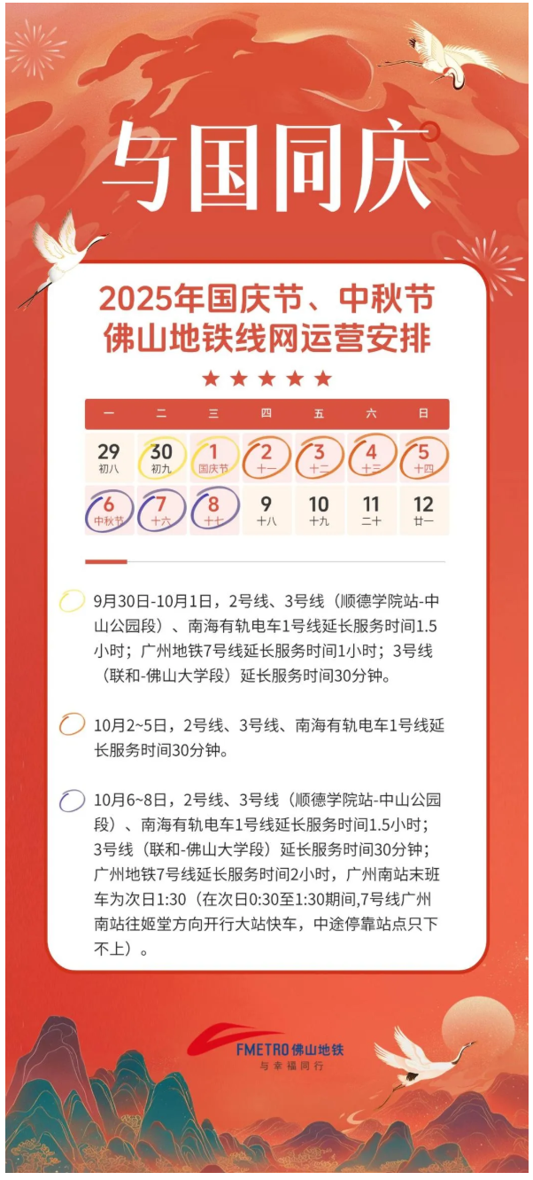 2025年国庆节、中秋节期间佛山地铁线网运营服务时间安排如下: