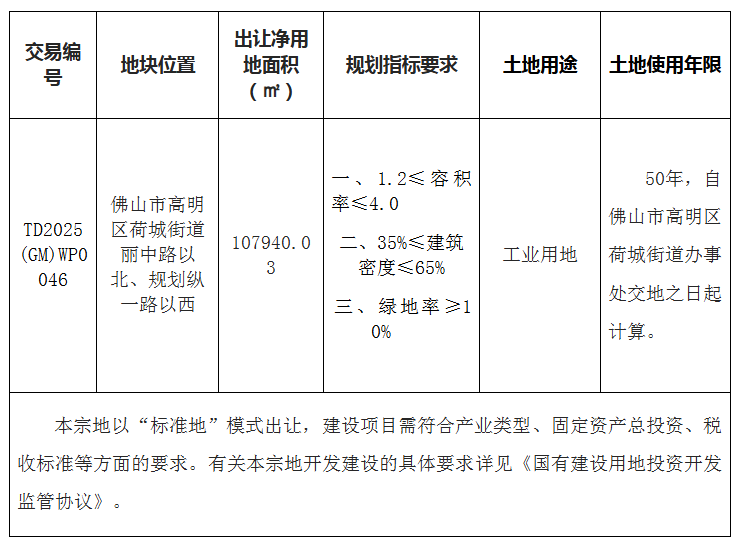 一、地块基本情况本块地其他规划建设要求按《高明区土地使用规划条件》(佛规明设函〔2025〕0075号)执行。