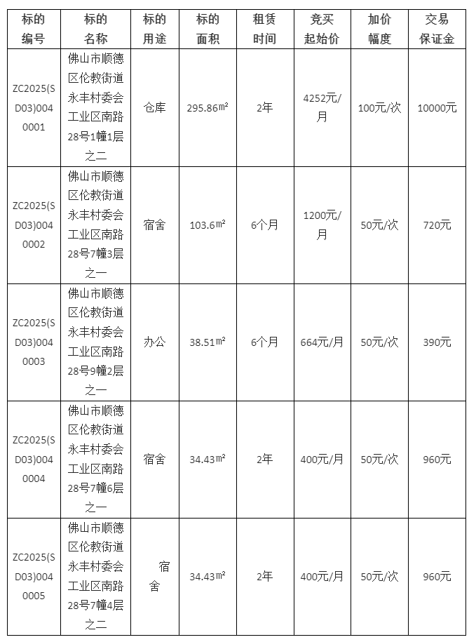 1.项目名称:佛山市顺德区伦教街道永丰村委会工业区南路28号1幢1层之二等五宗物业公开招租项目