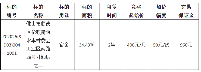 佛山市顺德伦安安防技术有限公司采用网上竞价方式出租位于佛山市顺德区伦教街道永丰村委会工业区南路28号7幢3层之二物业使用权,欢迎符合资格的竞买人参与竞价。