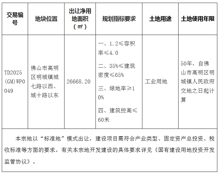 五、有意参与竞买者可于2025年10月11日后登录网上交易系统下载该地块的《佛山市高明区国有建设用地使用权网上拍卖出让文件》。