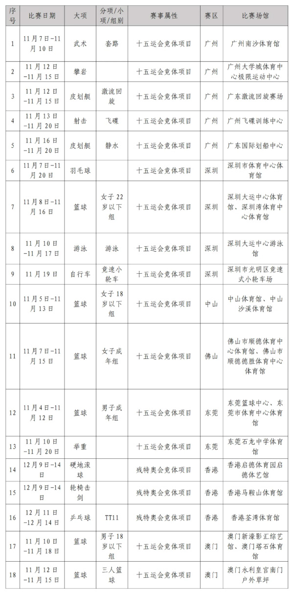 其中广东赛区13个项目,包括十五运会羽毛球、篮球(男子成年组、女子成年组、女子22岁以下组、女子18岁以下组)、武术(套路)、游泳、举重、自行车(竞速小轮车)、皮划艇(静水、激流回旋)、攀岩和射击(飞碟)项目,分布在广州、深圳、中山、佛山和东莞5个城市。