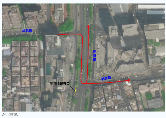 桂澜路-教育路路口西进口封闭后,原需从此处左转的车辆,可经华龙路驶入桂澜路,再通过桂澜路-教育路路口北进口完成转向。具体绕行流线如下: