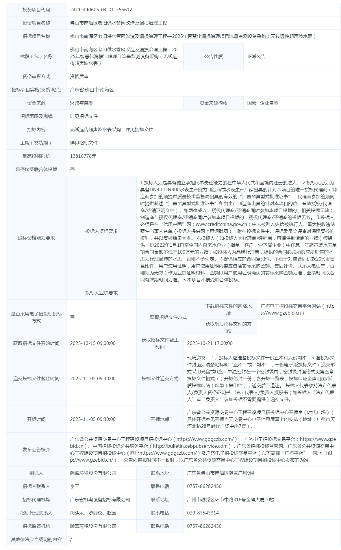 佛山市南海区老旧供水管网改造及漏损治理工程—2025年智慧化漏损治理项目流量监测设备采购(无线远传电磁水表)招标公告