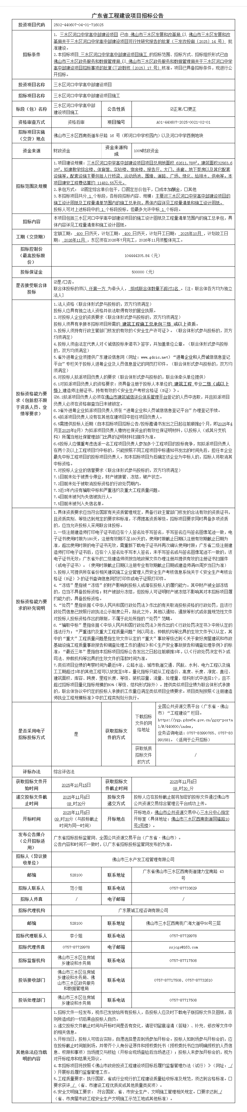三水区河口中学高中部建设项目施工招标公告