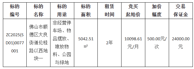 佛山市顺德区景良投资发展有限公司采用网上竞价方式出租位于佛山市顺德区大良街道伦桂路以西地块一,欢迎符合资格的竞买人参与竞价。