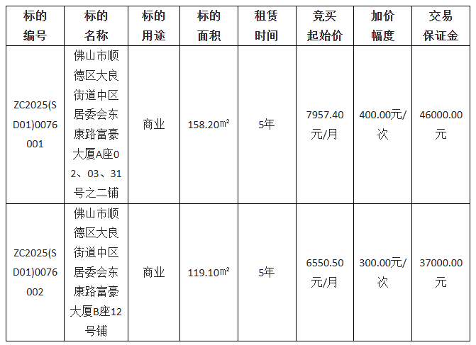 佛山市顺德区景良投资发展有限公司采用网上竞价方式出租位于佛山市顺德区大良街道中区居委会东康路富豪大厦A座02、03、31号之二铺等2宗物业,欢迎符合资格的竞买人参与竞价。