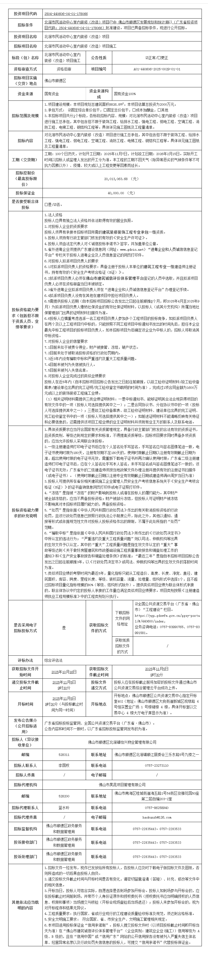 顺德北滘市民活动中心室内装修(改造)项目施工招标公告