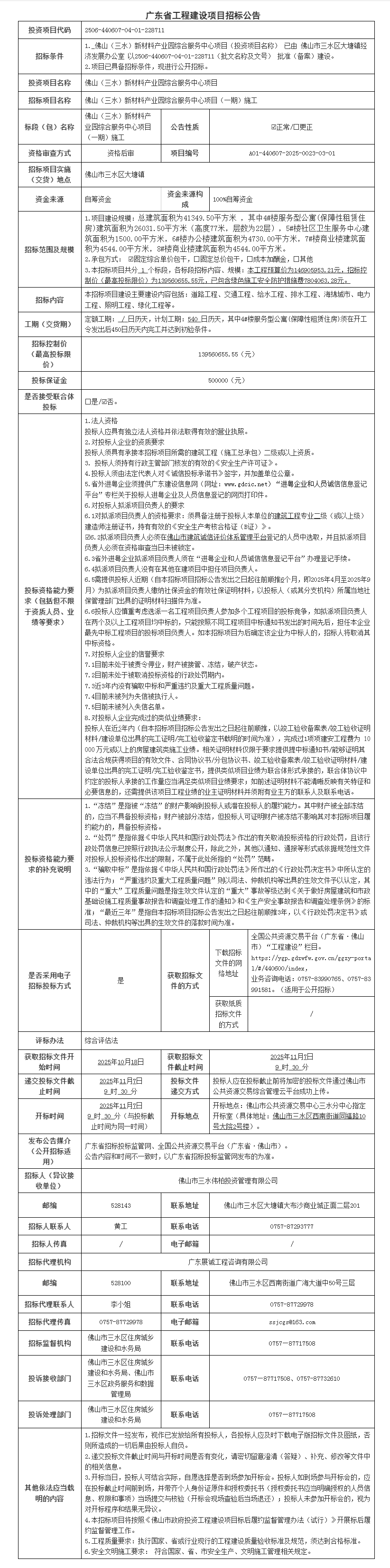 佛山(三水)新材料产业园综合服务中心项目(一期)施工招标公告