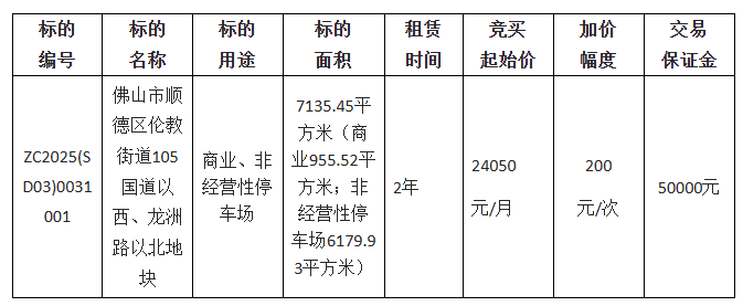佛山市顺德区伦安安防技术有限公司采用网上竞价方式出租位于佛山市顺德区伦教街道105国道以西、龙洲路以北地块使用权,欢迎符合资格的竞买人参与竞价。