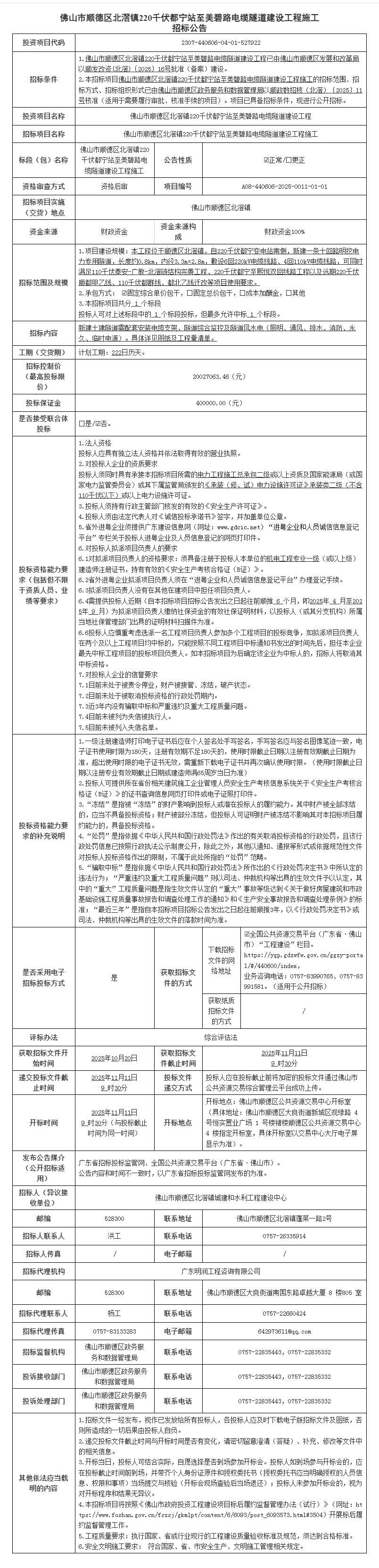 佛山市顺德区北滘镇220千伏都宁站至美碧路电缆隧道建设工程施工招标公告