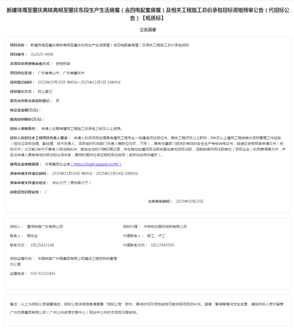 新建珠海至肇庆高铁高明至肇庆东段生产生活房屋(含四电配套房屋)及相关工程施工总价承包招标