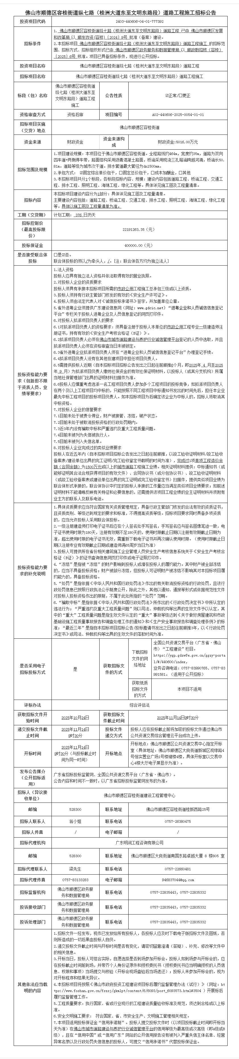 佛山市顺德区容桂街道纵七路(桂洲大道东至文明东路段)道路工程施工招标公告