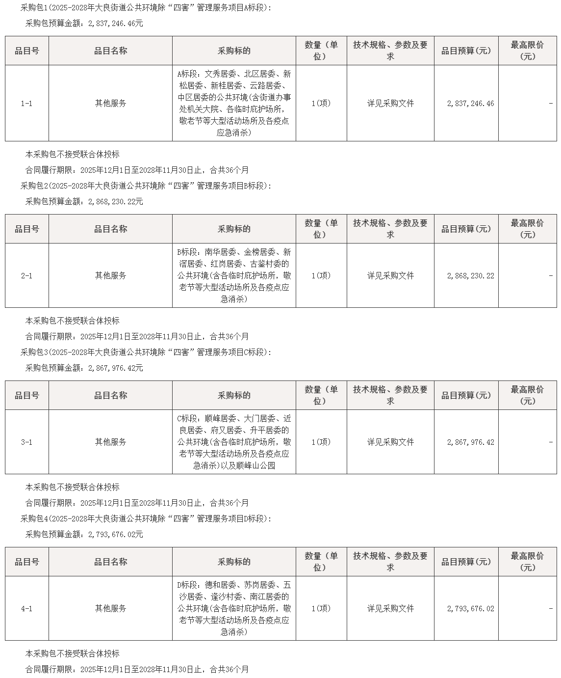 2025-2028年大良街道公共环境除“四害”管理服务项目招标项目的潜在投标人应在广东省政府采购网https://gdgpo.czt.gd.gov.cn/获取招标文件,并于 2025年11月18日 09时00分 (北京时间)前递交投标文件。