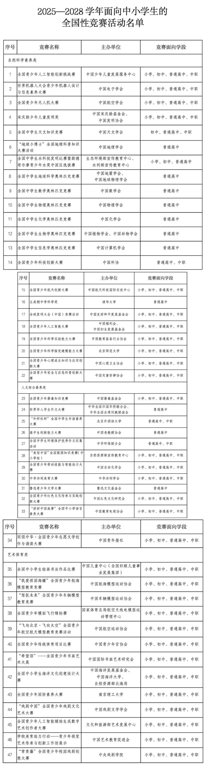 日前,教育部公布了《2025—2028学年面向中小学生的全国性竞赛活动名单》(俗称“白名单”),共有“全国青少年人工智能创新挑战赛”等47项竞赛进入名单。
