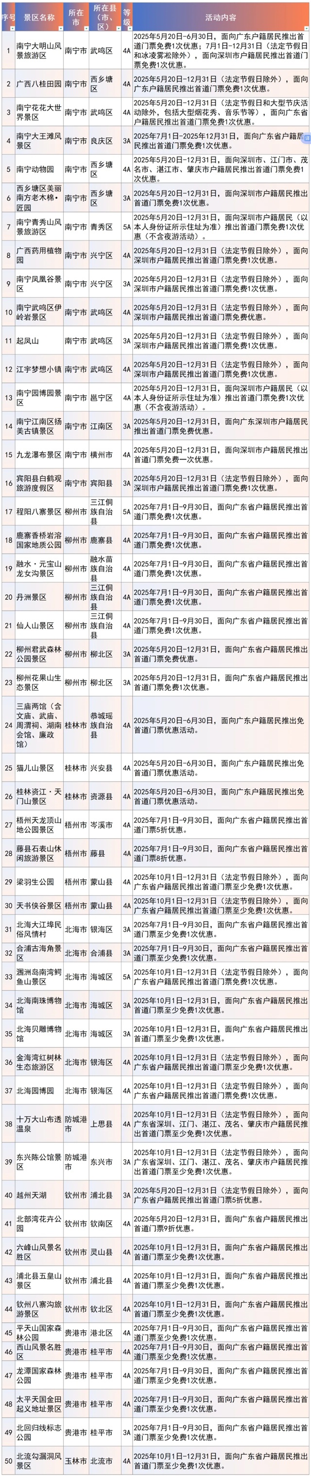 近年来,广东省开展了多层次、多形式、宽领域、全方位帮扶协作,为感谢广东的真情帮扶,自2025年5月20日起,广西102家景区面向广东省户籍居民推出门票优惠活动,景区涵盖广西全部地级市,包括4家5A级、72家4A级国家旅游景区,免首道门票的景区90家、首道门票和旅游项目打折的景区12家。
