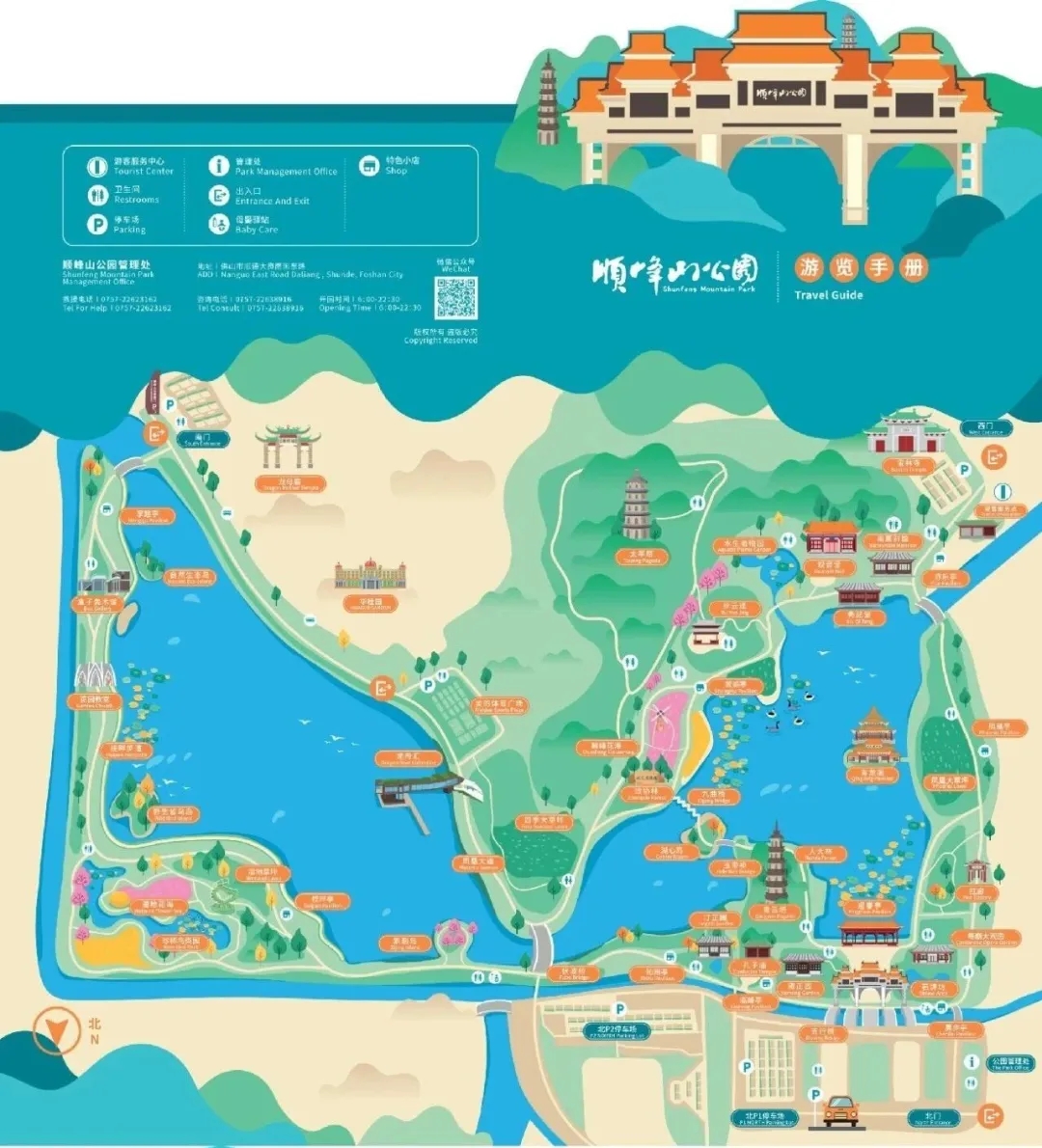 顺峰山位于佛山市顺德区新城区西北部,始建于1999年,2005年国庆期间正式开放,占地面积8209亩,属亚热带季风性湿润气候区。公园以"山色水韵"为主题,依托太平山、神步山、桂畔湖、青云湖等自然山水格局,形成"青山、碧水、一寺、两湖、两塔"景观体系。核心景观包含长85米、宽8米、高37.6米的巨型中式牌坊,采用三跨拱结构(主跨度27米)。太平山西麓的宝林寺与明代万历年间的青云塔、旧寨塔构成历史建筑群 。