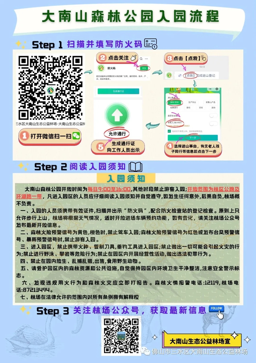 提醒:大南山林场的主要职责是森林防火、森林保育、野生动植物保护等,出于安全考虑,林场尚未完全对外开放,市民游客请勿擅自闯入未开放区域。