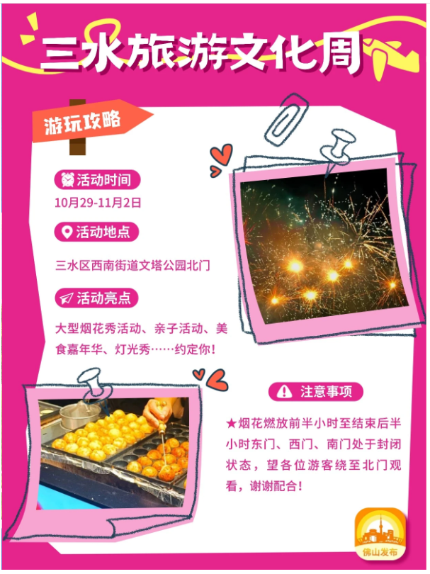 概述:三水旅游文化周:大型烟花秀每晚9点准时绽放,还有灯光秀、舞台表演、美食嘉年华等一系列精彩活动供大小朋友参与。......
