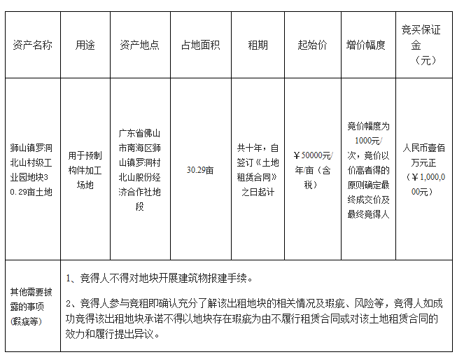 2.佛山市公共资源交易中心南海分中心通过佛山市资产交易网上交易系统及粤公平网站发布的项目信息(包括但不限于公告信息、交易文件、合同条款等)并不构成佛山市公共资源交易中心南海分中心对项目的任何交易建议。意向竞买人应不依赖于已披露的项目信息并自行对项目的相关情况进行必要的尽职调查和充分了解,对是否竞买该项目及项目成交后可能发生的费用和存在的风险自行作出充分评估,并独立承担所有风险。意向竞买人一经申请参加竞买,即视为知晓、认可项目现状,佛山市公共资源交易中心南海分中心对此不承担任何法律责任。