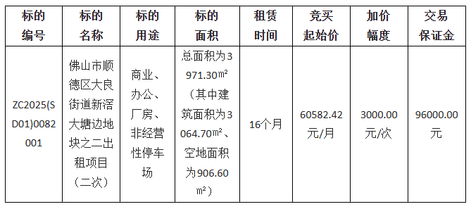 佛山市顺德区大良德良物业管理公司采用网上竞价方式出租位于佛山市顺德区大良街道新滘大塘边地块之二,欢迎符合资格的竞买人参与竞价。