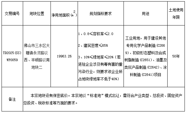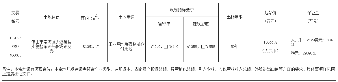 备注:本宗地设有保密底价。本宗地开发建设需符合产业类型、注册资本、固定资产投资总额、经营纳税总额、引入企业、应税营业收入总额、外贸进出口值等方面的要求,具体事项详见网上挂牌出让文件。
