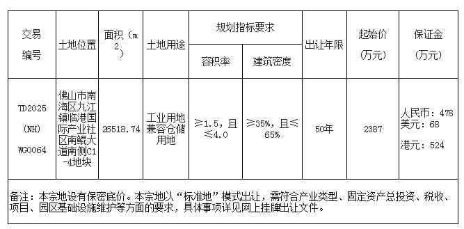 > 佛山市南海区九江镇临港国际产业社区南鲲大道南侧C1-4地块网上挂牌出让