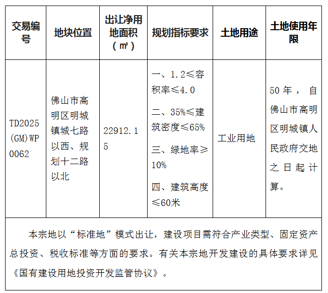 概述:本宗地以“标准地”模式出让,建设项目需符合产业类型、固定资产总投资、税收标准等方面的要求。有关本宗地开发建设的具体要求详见《国有建设用地投资开发监管协议》......