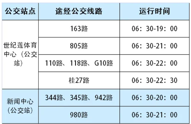 (2)公交出行:世纪莲东门周边设有2个公交站点,世纪莲体育中心(公交站)共有线路6条;新闻中心(公交站)共有线路4条。