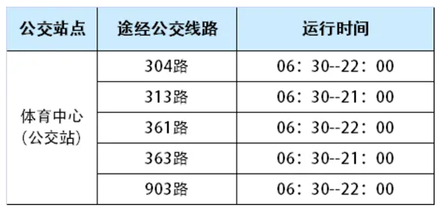 (2)公交出行:体育中心对开设有体育中心公交站点,共有线路5条。