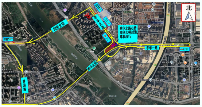 一期施工时,季华北路至季华大桥底上桥辅道封闭,去往绿岛湖的车辆,可在季华北路掉头车道掉头,绕行至同济路大桥后经禅港路汇入季华西路;也可绕行至季华一路华宝路隧道处,掉头后汇入季华大桥往西通行。