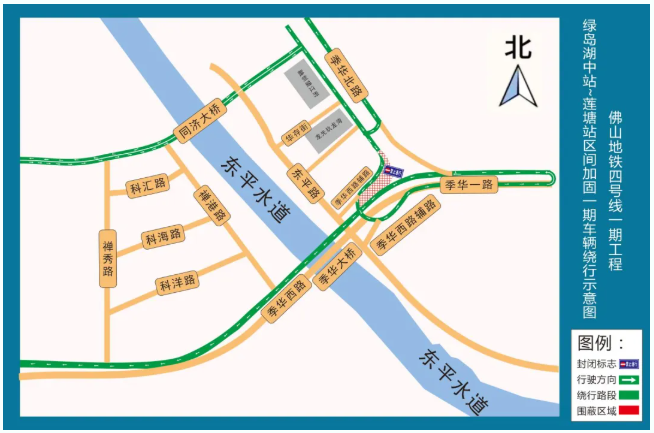 由于佛山市城市轨道交通四号线工程绿岛湖中站至莲塘站区间加固工程施工需要,从11月8日0时起,季华北路往季华西路北侧辅道(季华大桥底辅道)需分两期进行局部调整围蔽施工。