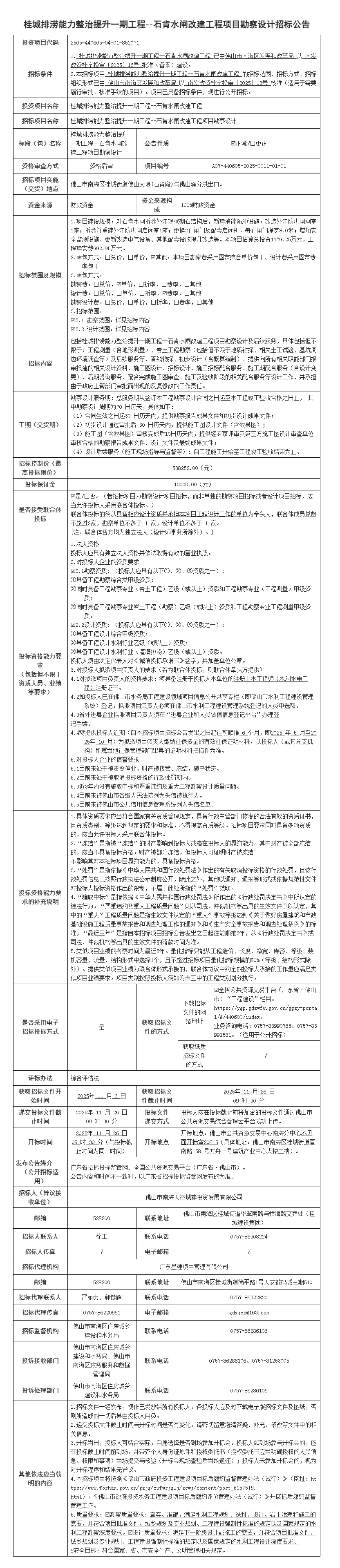 南海桂城排涝能力整治提升一期工程--石肯水闸改建工程项目勘察设计招标公告