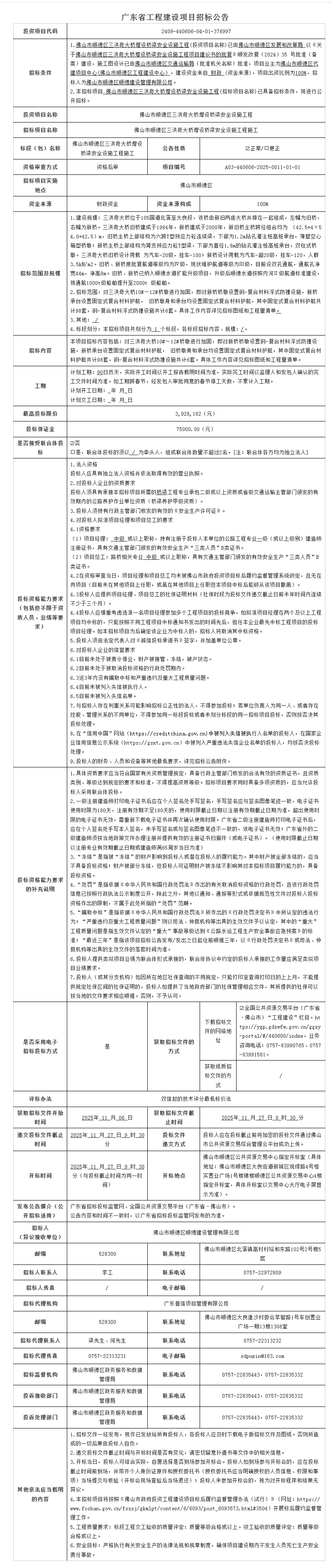 佛山市顺德区三洪奇大桥增设桥梁安全设施工程施工招标公告