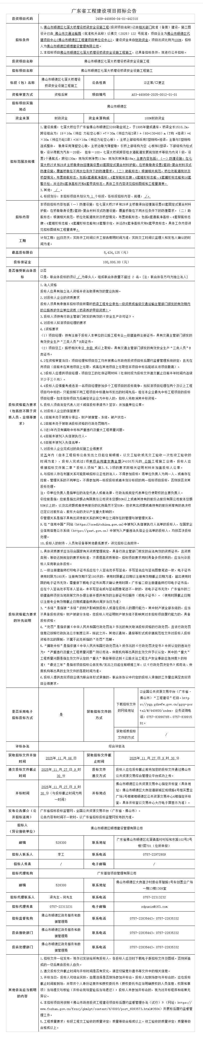 佛山市顺德区七滘大桥增设桥梁安全设施工程施工招标公告