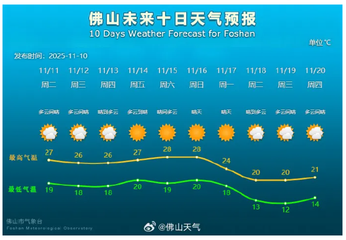 11月11日至13日佛山市以多云间晴,气温小幅下降,非常适宜龙狮赛事的举行和观众现场观赛。