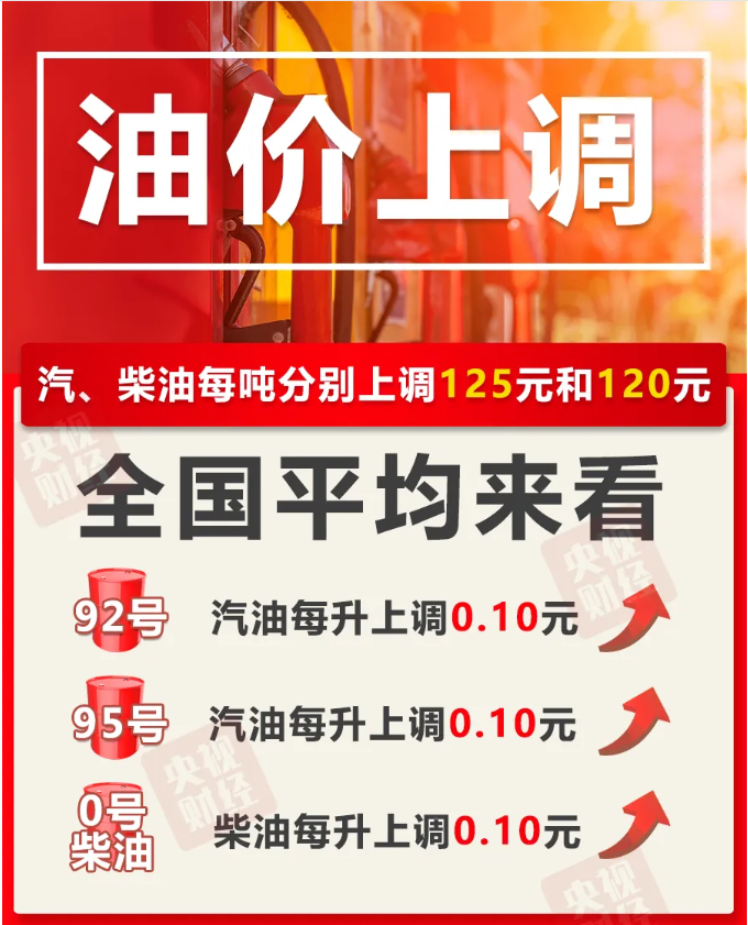 从11月10日24时起,国内汽、柴油零售限价每吨分别上调125和120元,全国平均来看,92号汽油、95号汽油和0号柴油每升均上调0.10元。