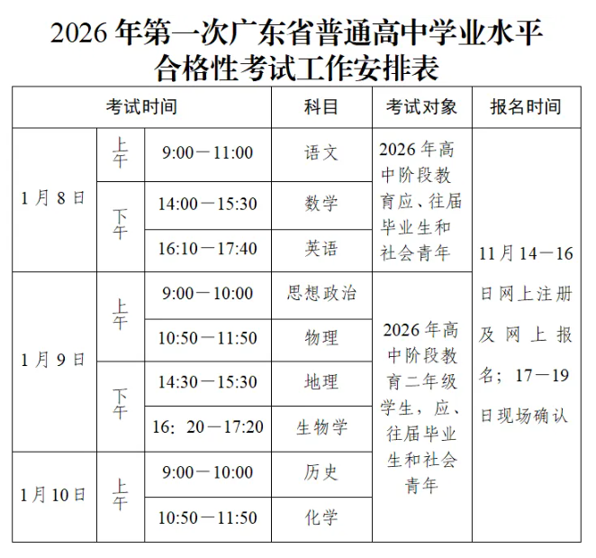 2026年第一次广东省普通高中学业水平合格性考试将于2026年1月8日至10日进行,考试科目为语文、数学、英语、思想政治、物理、历史、地理、化学和生物学等9门,具体安排见附件1。各科目均为新课标题型(按照2017年版2020年修订的普通高中课程方案和学科课程标准命题),其中历史、地理、化学、生物学、思想政治和物理6门科目题型为选择题,语文、数学和英语3门科目题型既有选择题,又有非选择题。各科目考试时长分别为:语文120分钟,数学、英语各90分钟,其他科目各60分钟。
