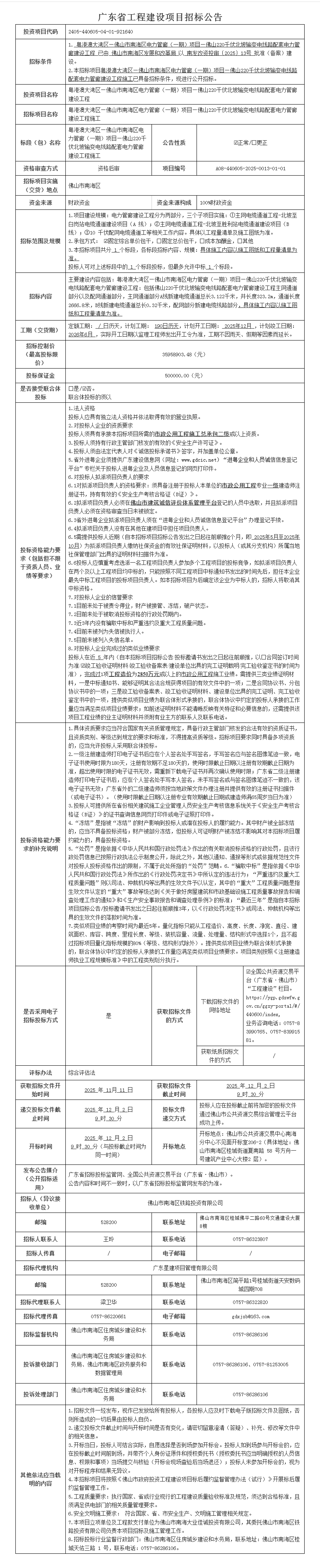 粤港澳大湾区—佛山市南海区电力管廊(一期)项目—佛山220千伏北坡输变电线路配套电力管廊建设工程施工招标公告