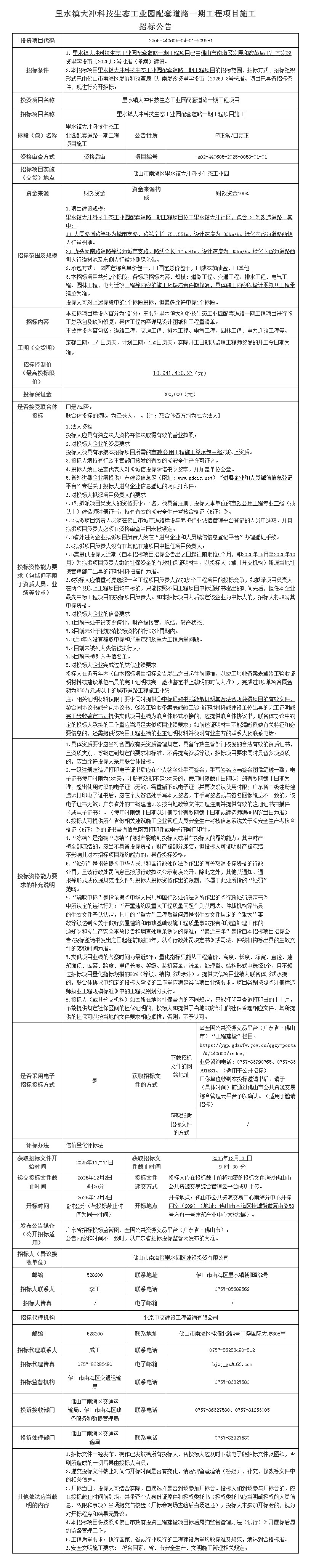 南海里水镇大冲科技生态工业园配套道路一期工程项目施工招标公告