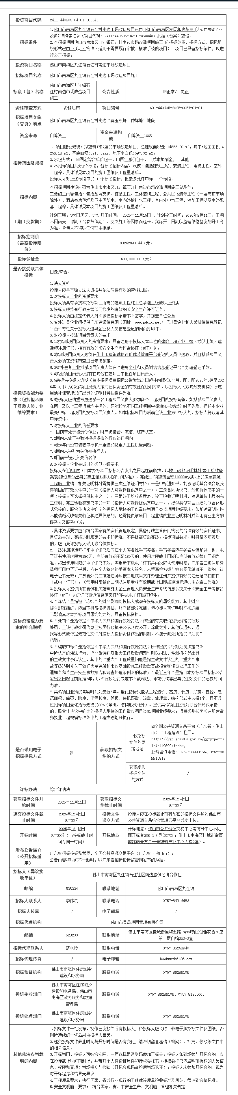 佛山市南海区九江镇石江村南边市场改造项目施工招标公告