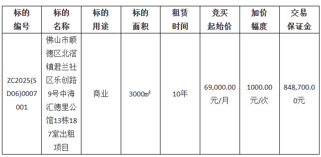 广东华伦招标有限公司受佛山市顺德区北滘镇财政和公有资产管理办公室委托采用网上竞价方式出租位于北滘镇君兰社区乐创路9号中海汇德里公馆13栋187室使用权,欢迎符合资格的竞买人参与竞价。