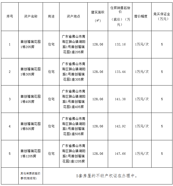 南海狮山镇首创禧瑞花园1栋205房等共5套住房销售项目