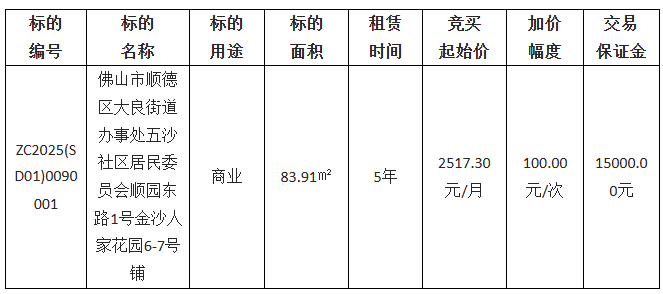 佛山市顺德区景良投资发展有限公司采用网上竞价方式出租位于大良街道办事处五沙社区居民委员会顺园东路1号金沙人家花园6-7号铺,欢迎符合资格的竞买人参与竞价。